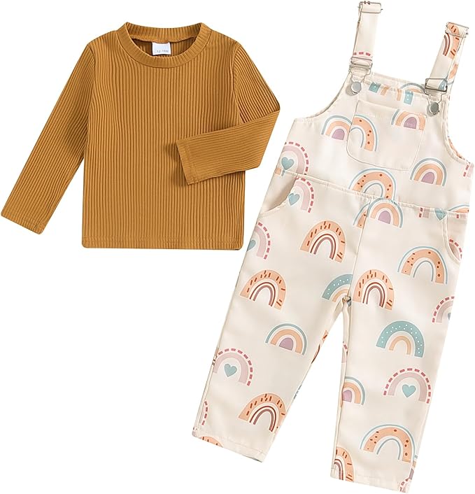Toddler Girl Fall Outfits Bib Overalls Jumpsuit Set Long Sleeve Ribbed Top Rainbow Suspenders Pants 2-Piece Clothing
