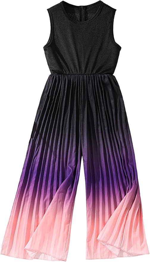 Girl's Pleated Sleeveless Jumpsuit Ombre Zipper Wide Leg Romper One Piece Outfit