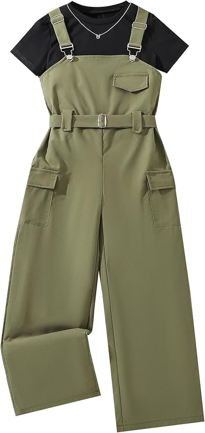 Girl's Overalls 2 Piece Outfits Short Sleeve Top and Cargo Jumpsuit Set with Pockets 7-14 Years