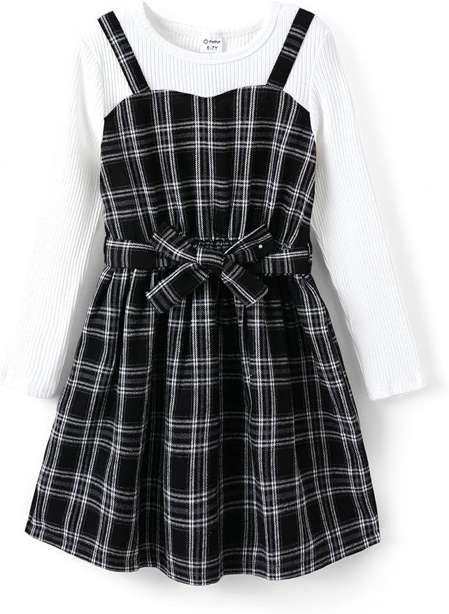 Girl's One Piece Outfit Long Sleeve Knit Tee and Checkered Hlter Dress Set with Belts for 5-12Y