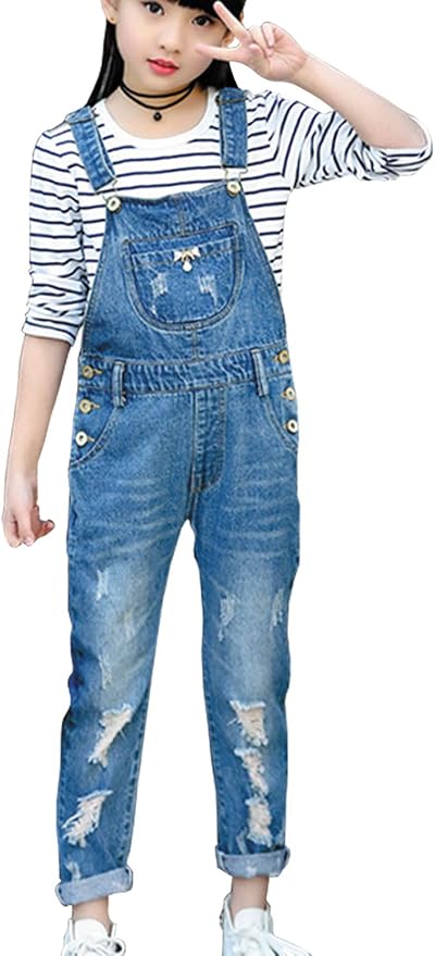 3-14 Years Kids Big Girls Jumpsuits & Rompers Distressed Bib Denim Overalls Blue Long Jeans Stretchy Ripped Jeans