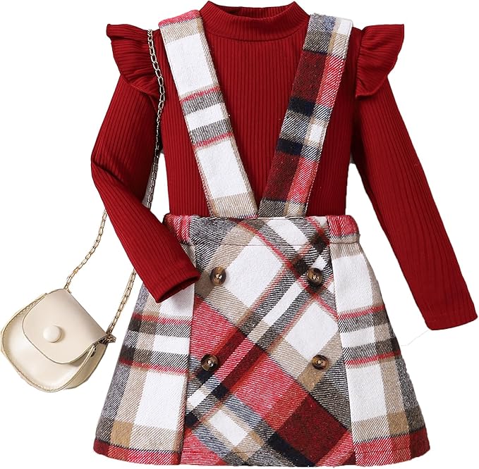 Toddler Girl Fall Winter Outfit Ribbed Knit Ruffle Sleeve Tops+Plaid Suspender Skirt 2Pcs Clothes Set